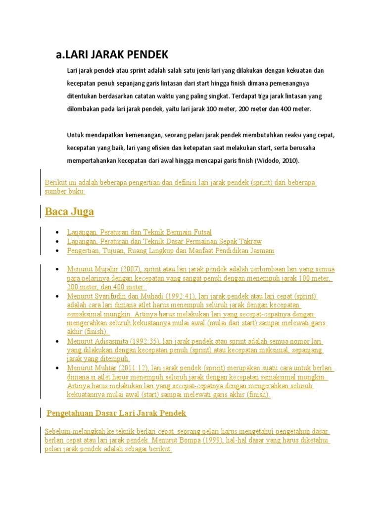 Hal ini dikarenakan jarak tempuh yang dimiliki lari cepat lebih pendek. Dalam lari jarak menengah, pada saat sudah hampir . Jelaskan perbedaan yang menonjol dalam menentukan kesuksesan lari sprint dan jarak jauh! Cabang olahraga lari dalam atletik terbagi dalam 5 kategori, yaitu lari jarak pendek (sprint), lari jarak menengah, lari jarak jauh, . Pengertian lari jarak pendek atau sprint tergolong jenis olahraga yang dilakukan dengan mengandalkan kekuatan dan kecepatan penuh sepanjang .